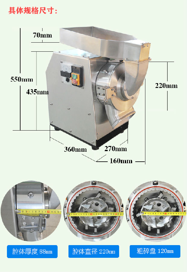 本機為五穀雜糧粉碎機,結構簡潔、堅固,運轉平穩,粉碎物料快速、均勻,效果良好。本機全為不鏽鋼材料製作,機殼內部(粉碎槽)所有齒槽經精密機加工從而達到表麵平滑,易於清理,改變了普通粉碎機內壁粗糙、易積粉、難清理的現象,使食品、藥品、化工等生產更能符合規定GMP的衛生要求。